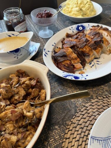 Um páskana eldaði ég svo dásamlega kalkúnamáltíð að við ákváðum að hafa hana aftur núna í kvöld til að fagna sumardeginum fyrsta. Máltíðin var einföld en alveg stórgóð og með henni útbjó ég bestu sósu sem ég hef smakkað með kalkún, þó ég segi sjálf frá. Annað meðlæti var kartöflumúsfylling með beikoni og döðlum, rauðkál og rifsberjahlaup. Kalkúnabringuna kryddaði ég með vel af Bezt á flest kryddblöndu og þakti hana svo með beikoni. Við það varð bringan einstaklega safarík og bragðgóð. Við vorum alsæl með þetta og gætum ekki verið ánægðari með þessa byrjun á sumrinu.