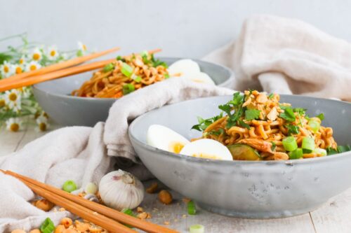 7. Skammtið á diska og toppið með jarðhnetum, kóríander, vorlauk og eggi.